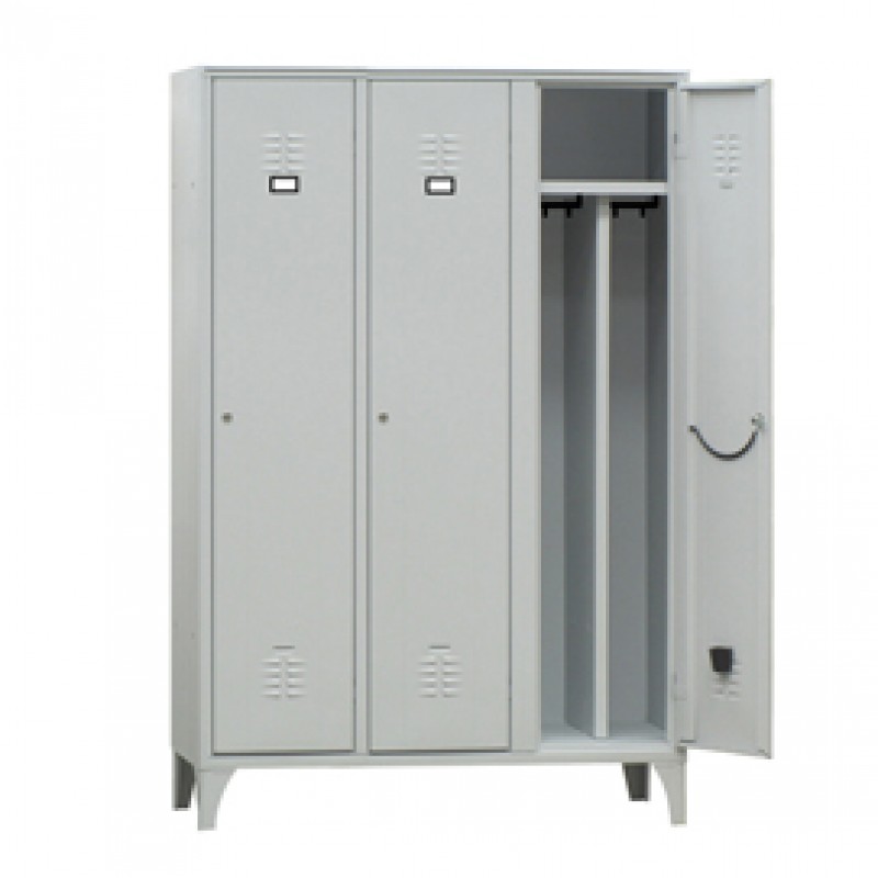 Armadio ad 3 vani con tramezza (per separazione sporco/pulito). Ogni vano è dotato di ripiano superiore con sottostante tubo ovale porta grucce in PVC completo di ganci scorrevoli. Tramezza sporco / pulito. Porta ombrello e vaschetta raccogli gocce su anta. Porta cartellino in materiale plastico applicato all’anta. Chiusura con serratura a cilindro con doppia chiave in dotazione. Fornito montato.