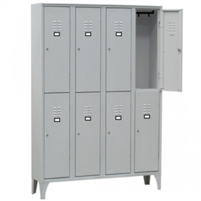 Armadio a 8 vani sovrapposti. Ogni vano è dotato di tubo ovale porta grucce in PVC completo di ganci scorrevoli non estraibili. Porta cartellino in materiale plastico applicato all’anta. Chiusura con serratura a cilindro con doppia chiave in dotazione. Fornito montato.