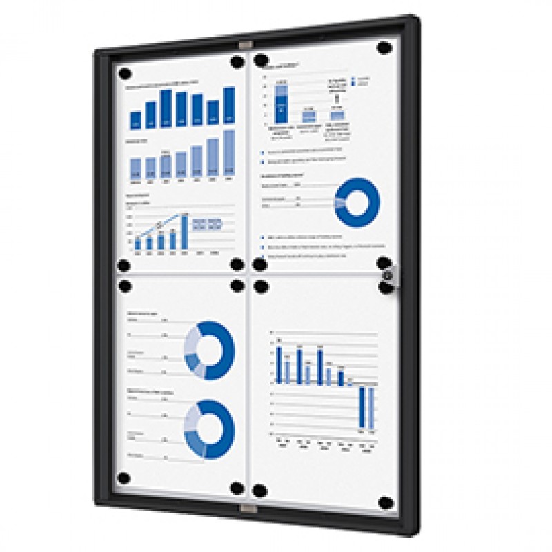 Bacheche per interni con cornice nera. Spessore 3mm e profondità interna di 12mm. Serratura a cilindro, con due chiavi in dotazione. Perfetta per uffici, scuole e spazi pubblici.