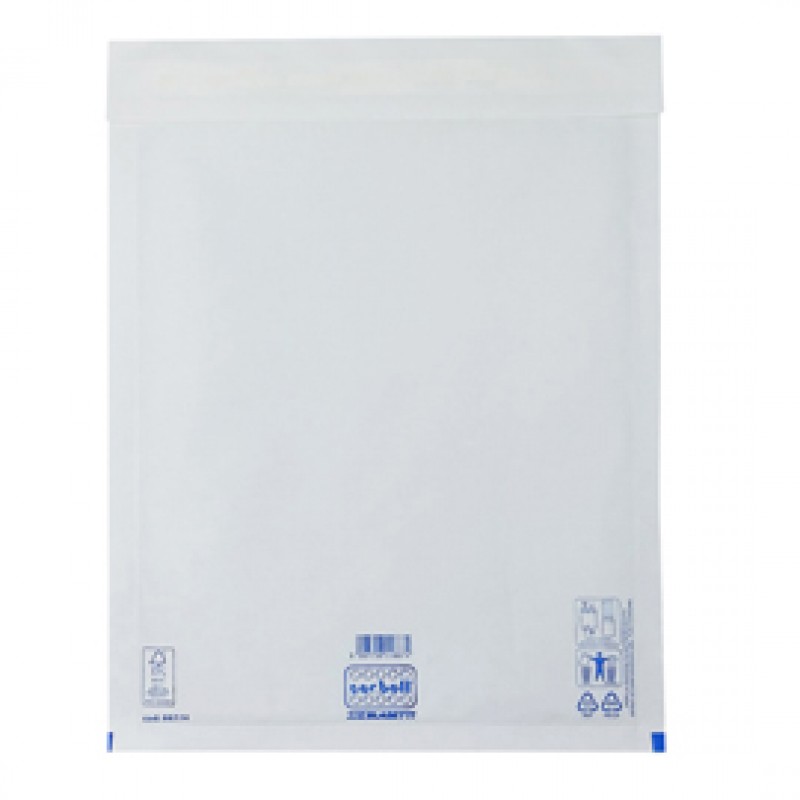 Sacco in carta bianca certificata FSC imbottito con pluriboll. Polietilene a bolle. Termosaldato su tre lati.Lembo autoadesivo protetto da Strip