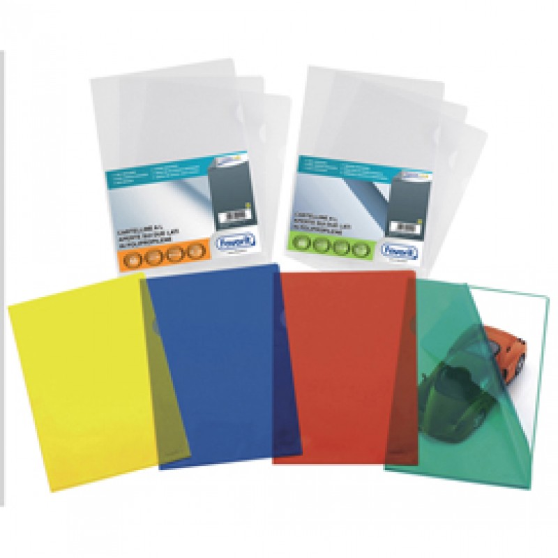 Cartelline a L trasparente a buccia d'arancia in polipropilene con lunetta per facilitare l'apertura. Formato utile: 21x29,7cm. Confezione da 50 cartelline. Made in Italy