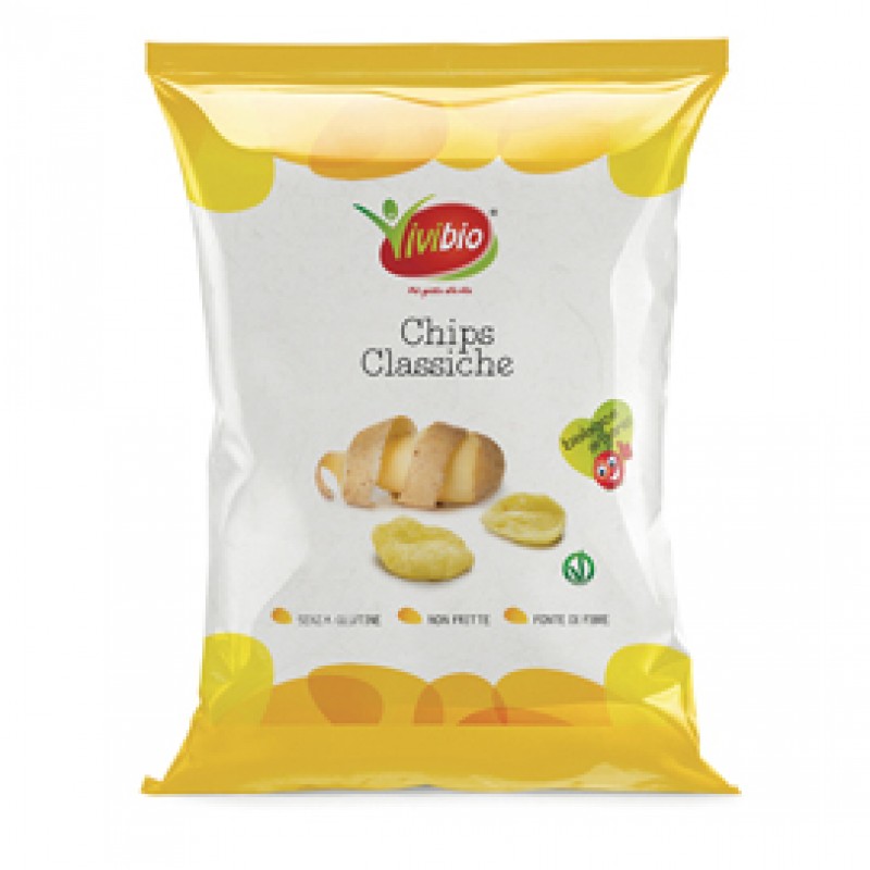 Snack biologico Vivibio a base di patate non fritte, ideale per una pausa croccante e sfiziosa. Croccanti e gustose chips classiche a base di patate. La differenza rispetto alle patatine già presenti sul mercato è il metodo di produzione: le patatine non vengono né fritte, nè cotte al forno ma preparate semplicemente utilizzando la tecnologia AIR. Pratica confezione da gustare anche fuori casa per uno spuntino spezzafame sano e gustoso. Senza glutine. Ingredienti: semilavorato di patate (94%) (farina di patate 63%, riso, amido di patate 14%), olio di semi di girasole, sale, curcuma