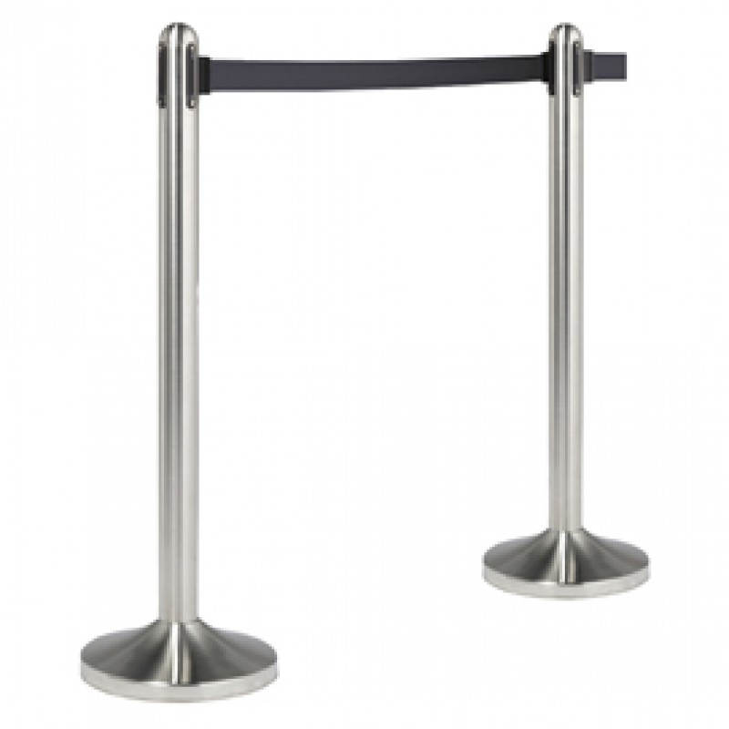 Colonnina in acciaio inox satinato H100cm con nastro in nylon da 210cm. Ogni colonnina ha 4 diversi punti per l'aggancio del nastro retrattile. Adatta sia per uso interno che esterno. Ogni colonnina comprende un attacco extra per fissare il nastro alla parete. Peso: 12Kg.
