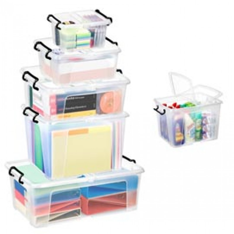 Contenitori multiuso in plastica trasparente ideali per riordinare e archiviare in modo intelligente e pratico. Dotati di maniglie a clip e di coperchio pieghevole per permettere l'accesso al contenuto anche quando fissato sul contenitore. Molto robusti e dal design moderno sono impilabili in modo stabile e forniscono una protezione perfetta contro umidità e polvere. Disponibili in 6 capacità.