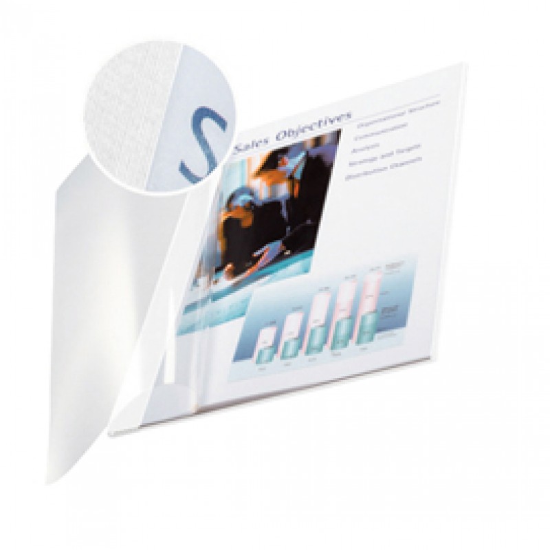 Cartelline termiche con fronte trasparente antigraffio e retro bianco grain.