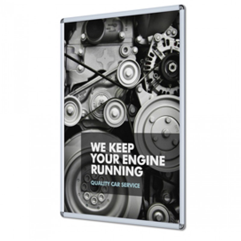 Cornici a scatto con angolo arrotondato e protezione antiriflesso in PVC. Fondo in materiale plastico PS. Tutte le cornici sono utilizzabili sia in orizzontale che verticale. Formato A4 (21x29,7cm) - profilo 25mm. Kit per fissaggio a muro non fornito.