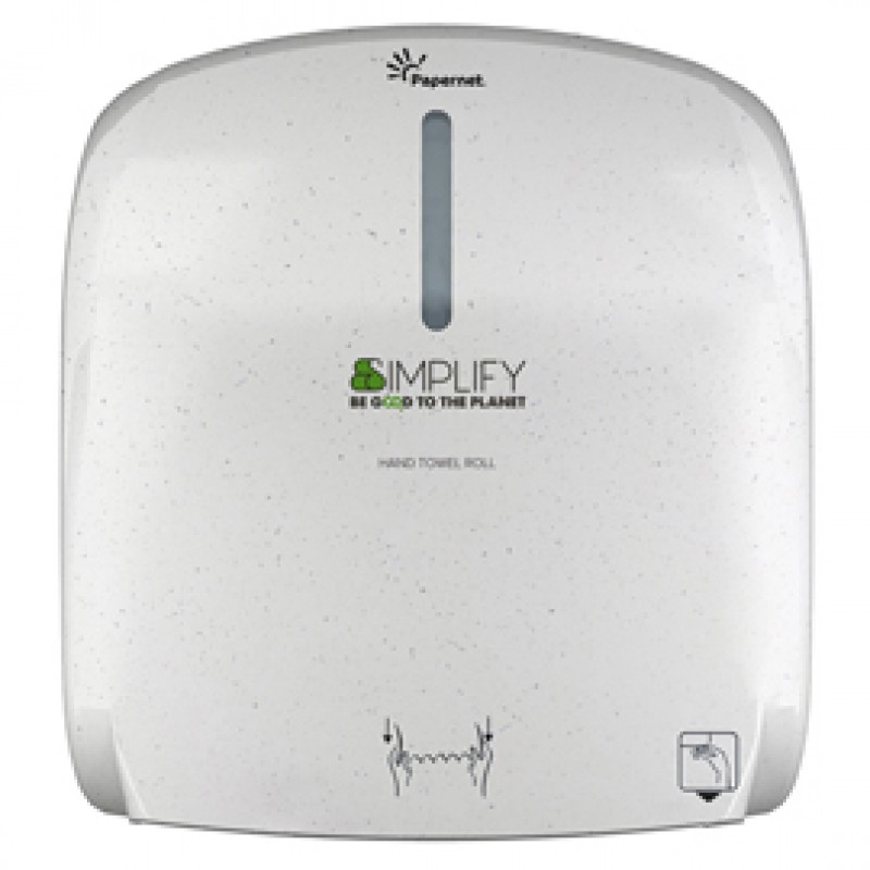 Dispenser Simplify per asciugamani piegati a Z/W (cod. 421336) realizzato per il 75% da materiale plastico post-consumo e materiali in eccesso proveniente dalla lavorazione del legno, al fine di garantire una riduzione degli sprechi nel rispetto dell'ambiente. Dispenser interamente riciclabili. Design pulito ed elegante, realizzato con materiali antiurto per maggiore praticità.