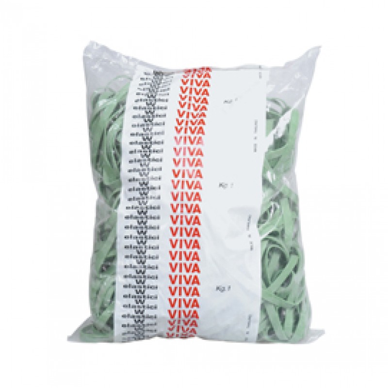 Sacchetto da 1kg di elastici in gomma verde a fettuccia larga 5mm.