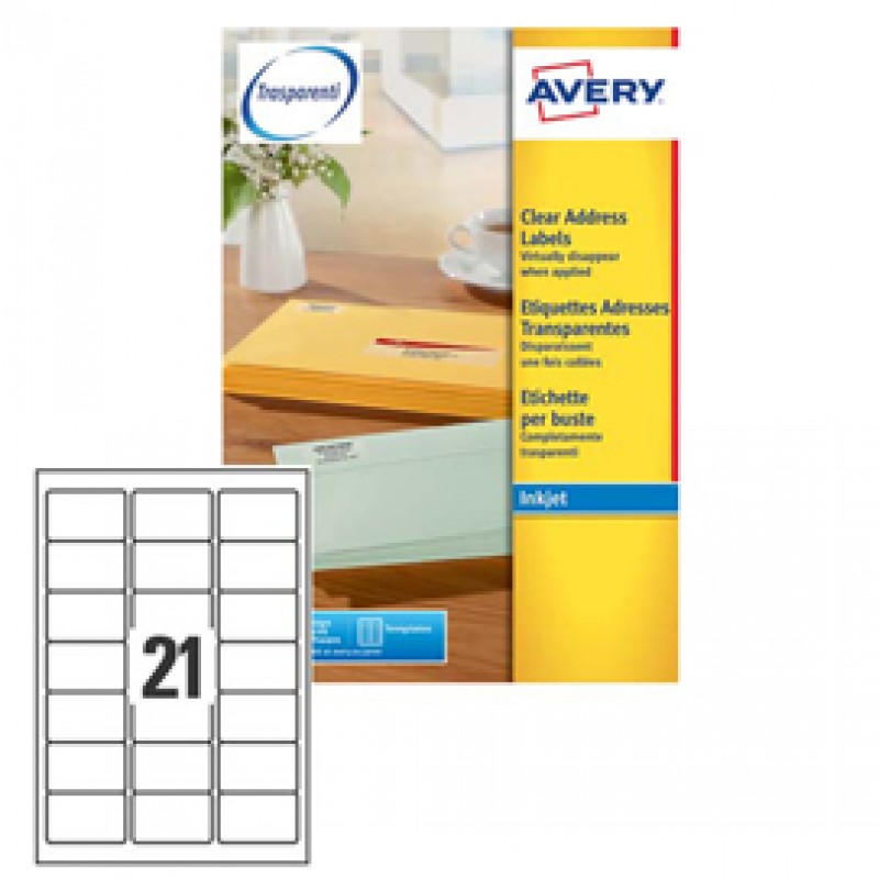 Etichette adesive J8560 - in PE - inkjet - permanenti - 63,5 x 38,1 mm - 21 et/fg - 25 fogli - trasparente - Avery