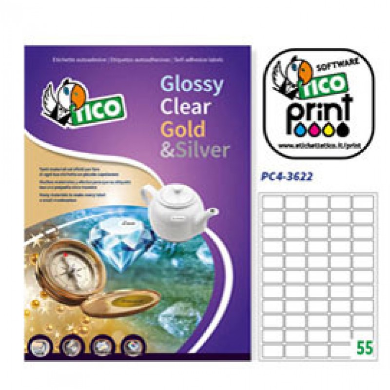 Etichette adesive PC4 - in poliestere - laser - permanenti - 36 x 22 mm - 55 et/fg - 100 fogli - trasparente - Tico