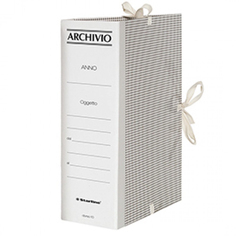 Cartella archivio con 3 lacci incollati. Realizzate in cartone teso grigio rivestito con carta uso mano da 80 gr/mq. Legacci a fettuccia fortemente fissati con collante. Formato 35x25cm. Dorso 10cm. Confezione da 25 faldoni.