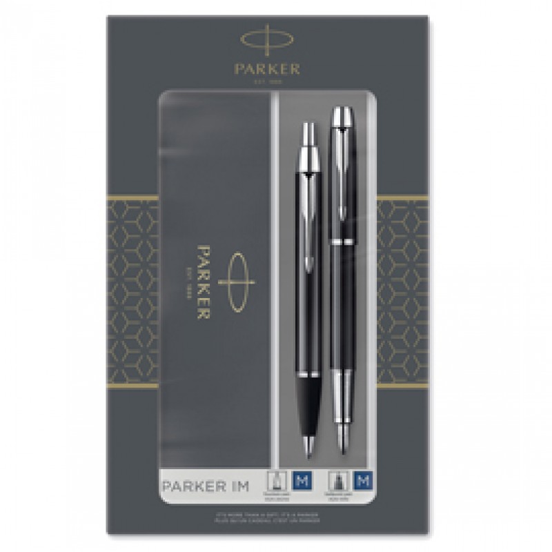 Elegante set in confezione regalo che comprende penna a sfera M IM Black CT + stilografica M IM Black. Realizzate in acciaio inox con eleganti dettagli cromati. Dotate dell'iconica clip a freccia Parker. Fornite con refill colore blu.