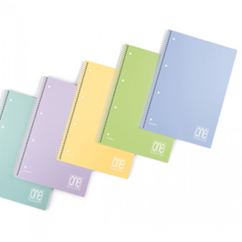 Maxiquaderno spiralato sul lato lungo. Formato 22,2x29,7cm. 80 fogli (160 facciate scrivibili). Forato e microperforato. Carta da 80 gr/mq. Doppia copertina in polipropilene nei colori One Color Pastel. Cartoncino di rinforzo bianco/bianco da 600 gr/mq. Spirale a molla.