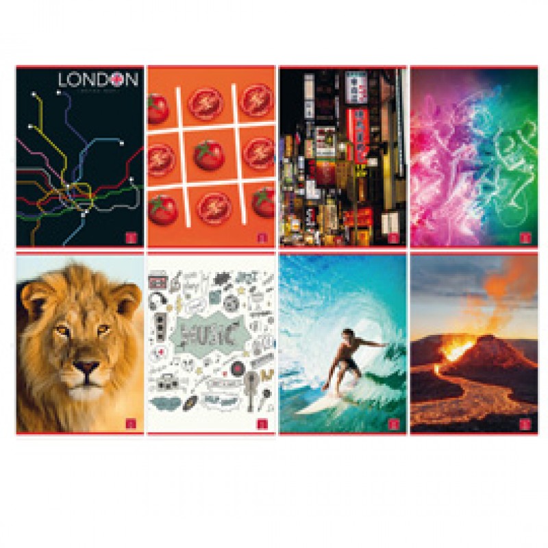 Maxiquaderno rilegato con punto metallico. Copertina in cartoncino da 205gr verniciatura UV. Risguardo personalizzabile stampato fronte e retro. Fantasie assortite.