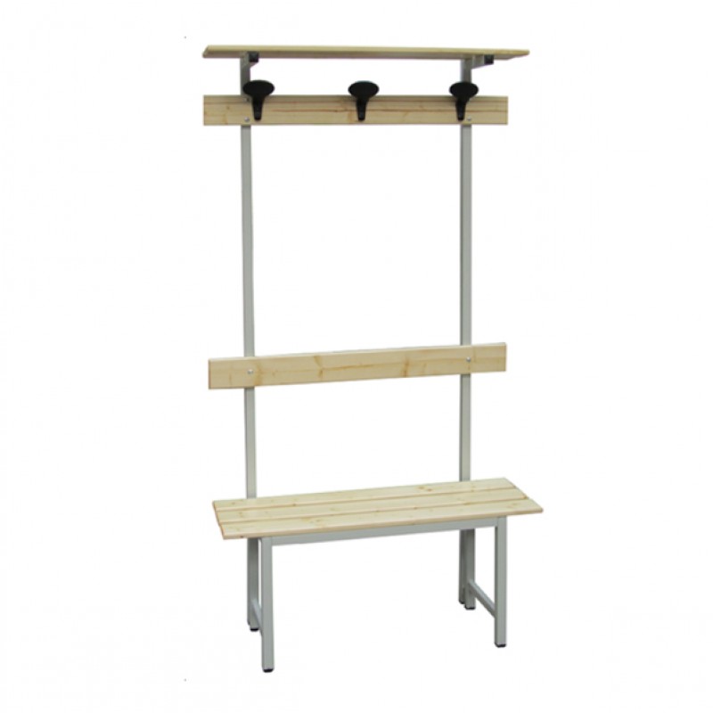 Panchina per spogliatoio a 3 posti completa di schienale, alzata con attaccapanni e cappelliera superiore.