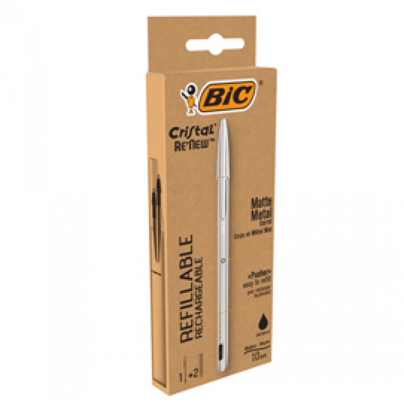Penna a sfera Cristal Re'New punta media 1mm. Corpo in metallo che dona un look elegante e moderno, cappuccio in plastica riciclata 96%. Dotata di pulsante col il livello d'inchiostro visibile per una sostituzione facile del refill. Fornita in astuccio di cartone riciclata al 100% con 2 refill inclusi.