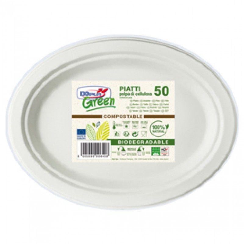 Piatto piano monouso - ovale - 26 x 19,5 cm - cellulosa - bianco - Dopla Green - conf. 50 pezzi