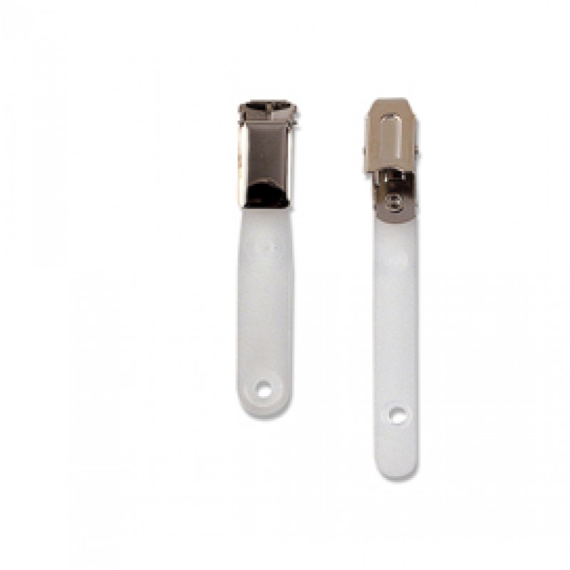 Pinzetta in metallo con chiusura a scatto e protezione salva tessuti in plastica morbida.