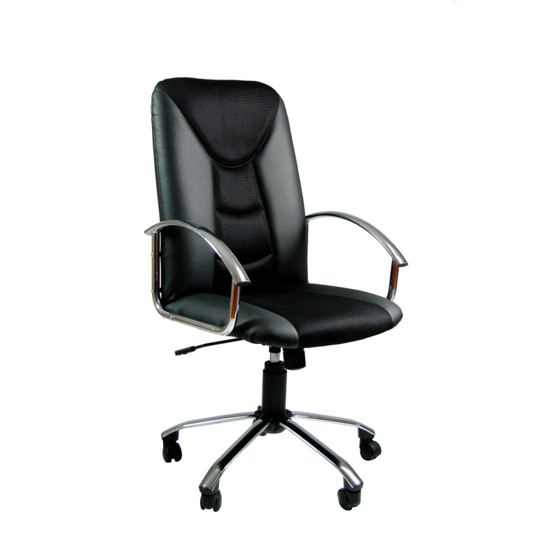 Poltrona direzionale con meccanismo di oscillazione con blocco.Rivestimento in pelle, interno in spugna hr alta densita'. Scocca in multistrato di legno di faggio, base a 5 razze in nylon diam. 620mm. Braccioli cromati. Sedile regolabile in altezza mediante pistone a gas (corsa 11cm). misure: h 106-117cm- l 56cm (compreso braccioli)- p 63cm. (h terra<->seduta 45-56cm). 15,5kg.