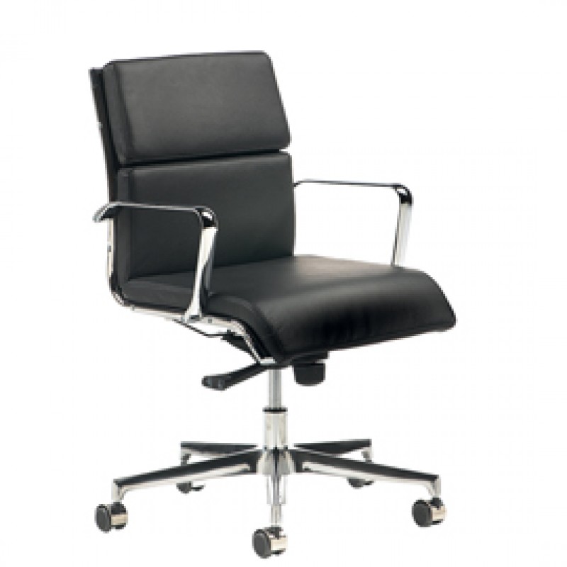 Poltrona direzionale girevole con elevazione a gas - meccanismo oscillante con blocco. Braccioli inclusi (non rimovibili). Rivestimento seduta in tessuto "PLUS - Eco Leather" idrorepellente, facile da pulire, senza flatati e flame retardant. Alt.tot.: 79-90cm; Prof.tot.: 68cm; Alt.schienale: 41cm; Larg.schienale: 48cm; Larg.seduta: 50cm; Prof.Sedile: 50cm; Alt. sedile: 42-54cm.