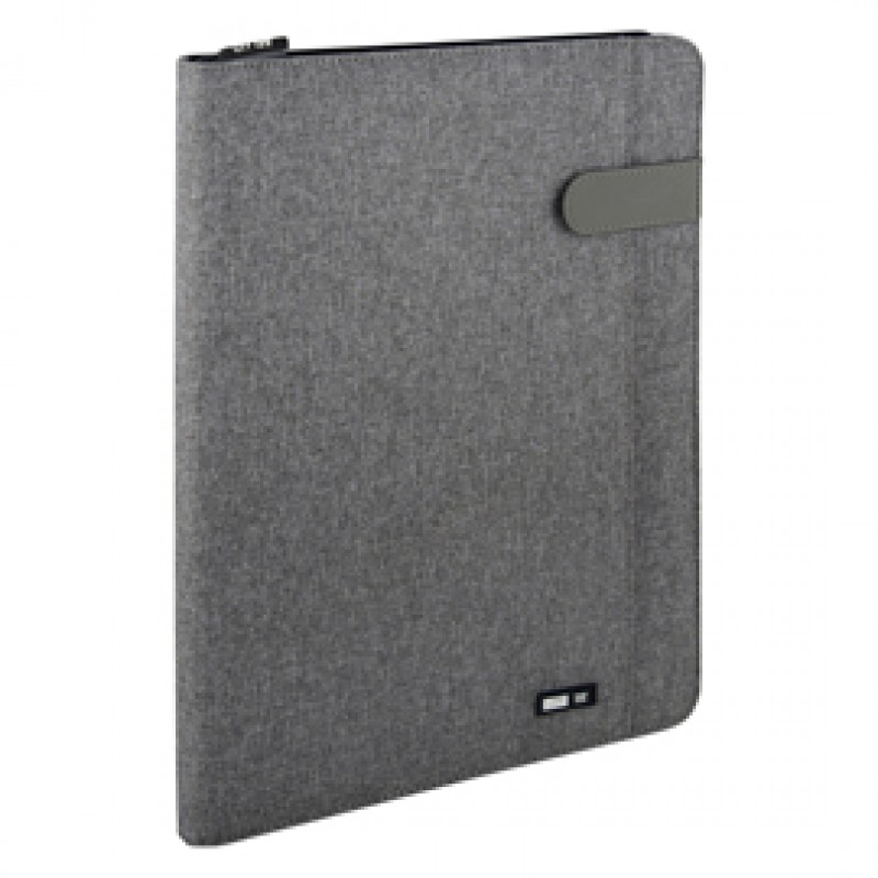 Portablocco in tessuto tecnico e chiusura in ecopelle. Formato A4 chiusura con zip, tasca esterna con chiusura a bottone, scomparti per biglietti, tasca interna portadocumenti, portapenna, completo di blocco.
