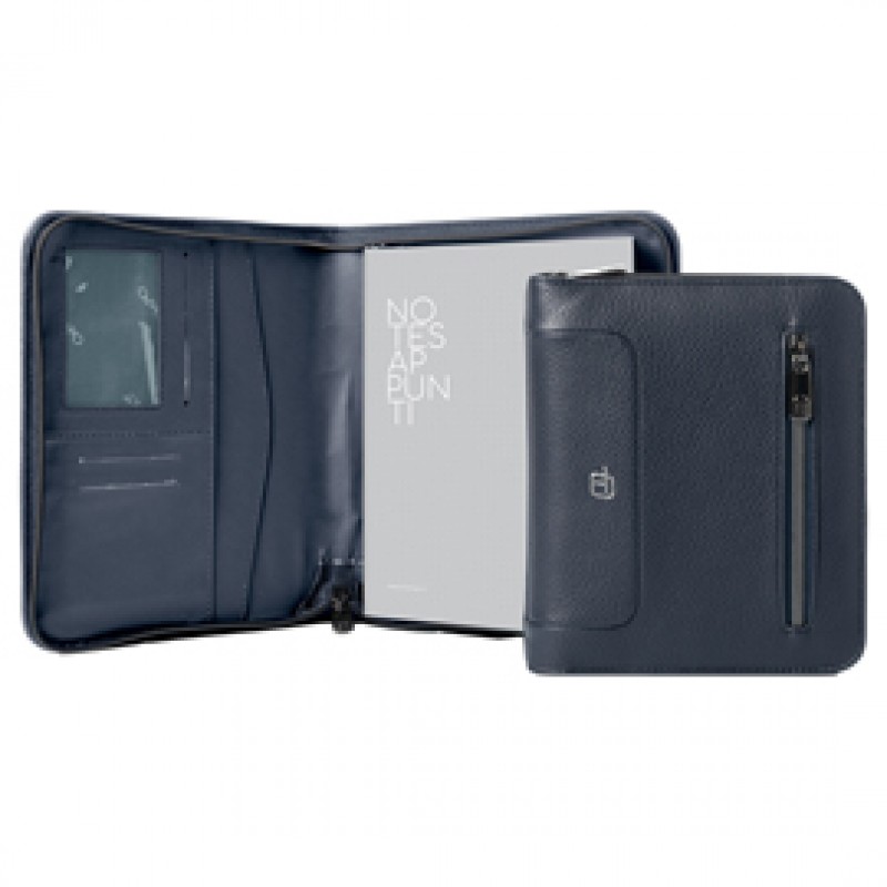 Portablocco A5 con zip. Blocco notes verticale A5, scomparti per biglietti, asola porta penne e tasca esterna con zip.