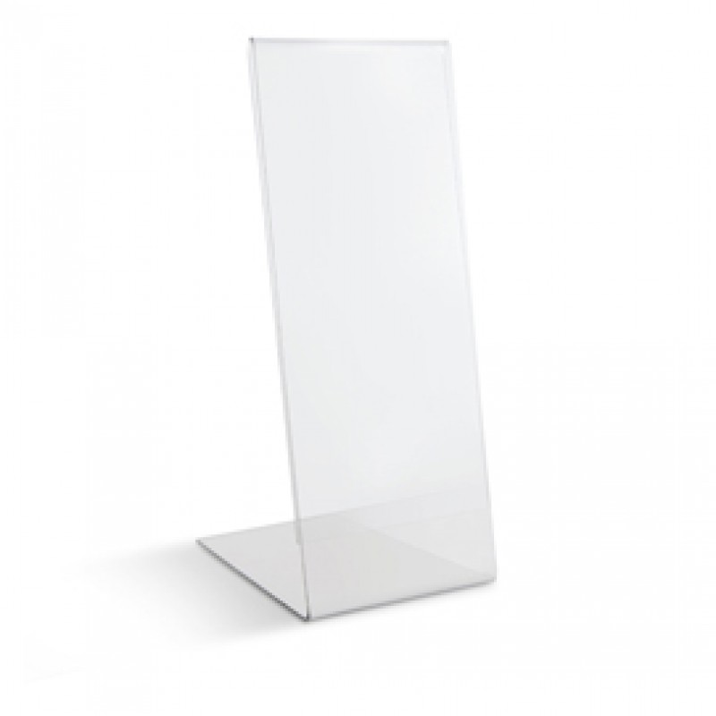 Display in PET trasparente (materiale riciclabile) idoneo al contatto con gli alimenti. Ottima resistenza agli urti e al fuoco. Ideale per ogni tipo di comunicazione e perfetto come porta menù o porta listino. Portadepliant con base a L utilizzabile sia in verticale che orizzontale. Formato 1/3 A4 - 10x21cm - spessore 1,5mm.