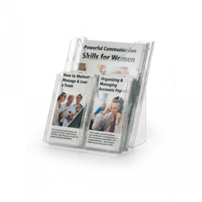 Espositore dotato di una vaschetta formato A4 e quattro vaschette formato 1/3 A4. Design semplice ed elegante. Può essere usato sia da tavolo che da parete senza dover acquistare adattatori addizionali: semplicemente i supporti posteriori possono essere ruotati di 180° per trasformare il modulo da tavolo in quello da parete in pochi secondi, mantenendo un angolo di visione ottimale in entrambi i casi. E' un sistema ad incastro che permette di combinare tra loro moduli Combiboxx anche di diverso formato.Dimensioni da tavolo: 242 x 229 x 291 mm (LxPxH).Dimensioni da parete: 242 x 150 x 445 mm (LxPxH).