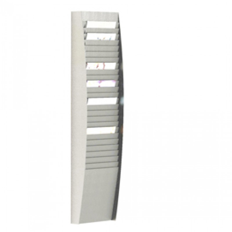 Portadocumenti/portariviste da muro con struttura in polistirene colore grigio chiaro. Modulo a 25 scomparti verticali.