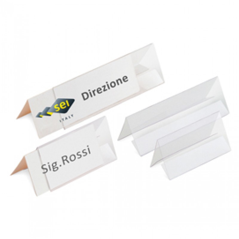 Porta nomi da tavolo in PVC rigido di alto spessore con foglio di etichette stampabili o scrivibili. Adatti a convegni, riunioni, congressi, segna prezzi, targhette identificative. Per mettere sul tavolo nomi e altre informazioni essenziali.