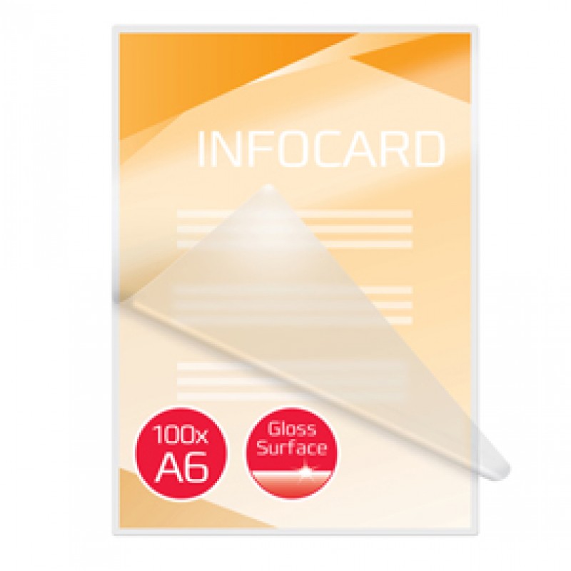 Pouches trasparente per plastificatrici GBC in formato A6, 11,1x15,4cm, spessore 75 micron per lato. Cento pezzi per confezione, in finitura lucida, bustine plastificanti preformate utilizzabili sia con carrier che senza, ottima adesione del collante.