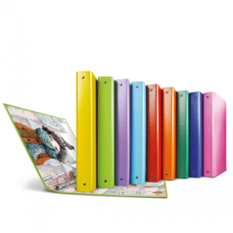 Raccoglitori in Stratopan® (cartone rivestito in PP) con interno in carta patinata lucida stampata. Soggetti e colori assortiti. Dorso 35mm, 4 anelli R, formato esterno 26,5x31cm, formato utile 22x30cm.