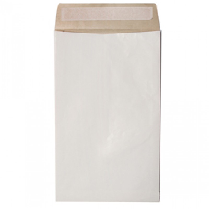Sacco in carta bianca triplo strato da 130 gr/mq, estremamente resistenti alle abrasioni e agli strappi accidentali. Lembo autoadesivo con striscia protettiva siliconata (Strip). Con soffietti laterali apribili fino a 4cm.