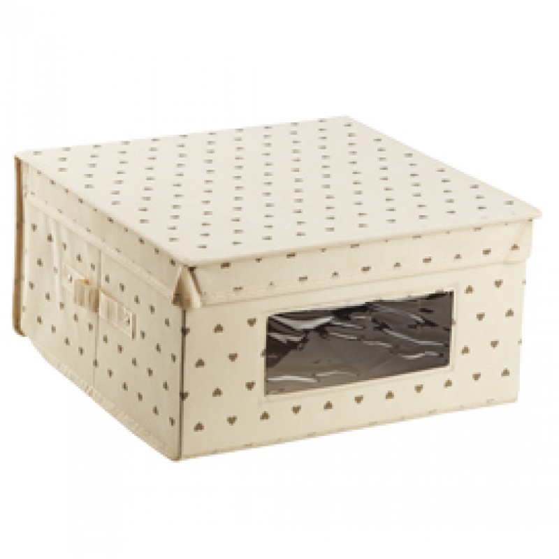 Scatola King Box in TNT con finestra. Adatta per riporre indumenti. Colore panna con fantasia a cuori. Dimensioni:36x36x19h cm