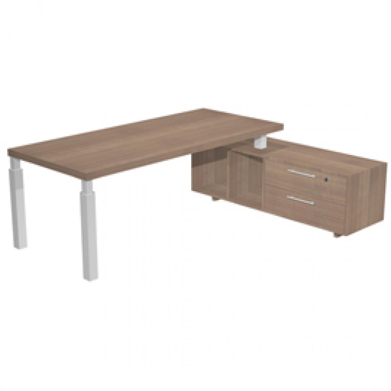 Postazione di lavoro composta da un piano sorretto da un mobile di servizio portante (reversibile destro o sinistro) e da una coppia di gambe in metallo a sezione quadrata complete di piedini regolabili in altezza. Le gambe hanno sezione 70x70 mm sul fusto e 40x40 mm nella parte alta e si agganciano al desktop ognuna con una robusta piastra metallica. Desktop (sp. 38 mm) con bordo antiurto in ABS (sp. 2 mm). Mobile di servizio: struttura sp. 18 mm, due vani a giorno (cm 37,7 x 42,4 x 48h), due ampi cassetti (dimensioni utili in cm 72 x 37,5 x 17h) scorrevoli su guide metalliche con fermo a fine corsa. Robuste ed eleganti maniglie in metallo. Primo cassetto completo di serratura. Le gambe, in entrambe le versioni di colore, sono impreziosite da dettagli e particolari cromati.