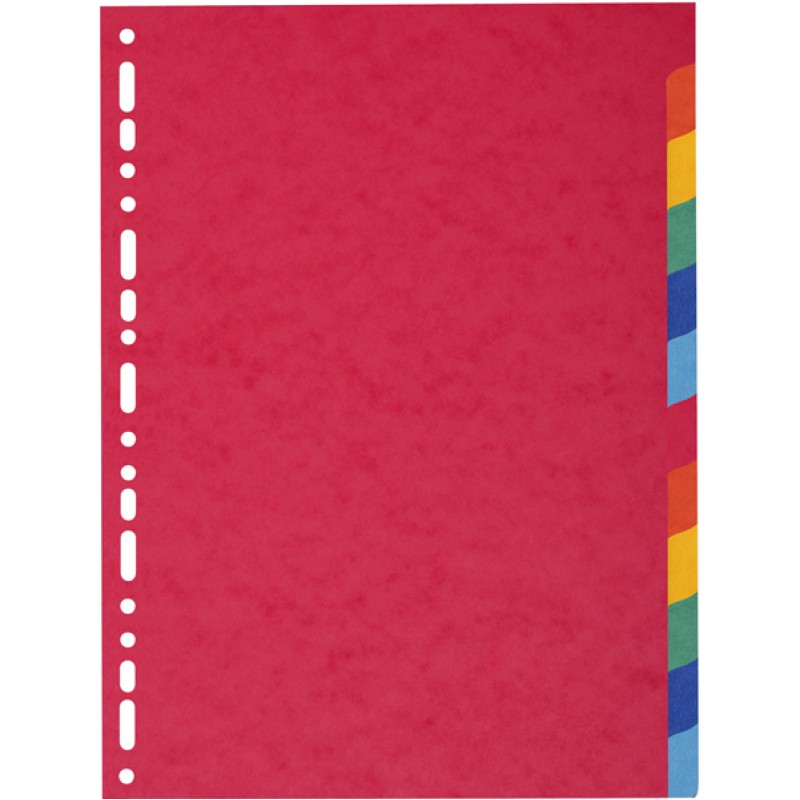 Divisori in cartoncino riciclato (certificazione Blue Angel) da 220 gr. Dotati di 12 tasti neutri colorati (colori assortiti). Perforazione universale. Formato esterno: 22,5x29,7 cm.