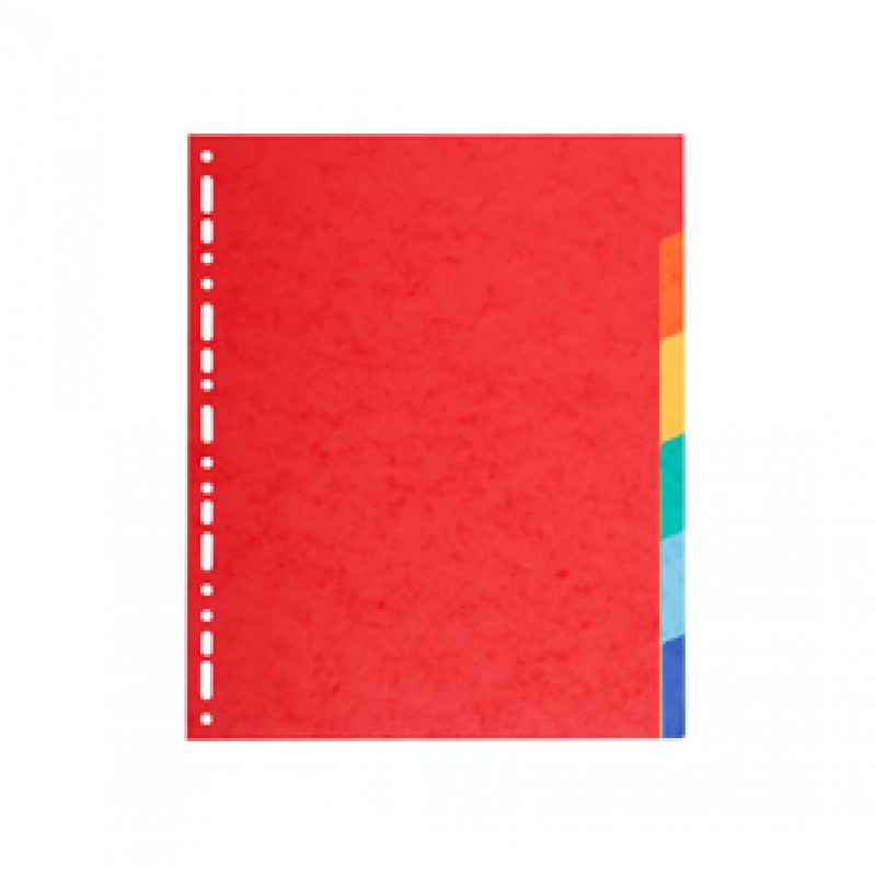 Divisori in cartoncino riciclato (certificazione Blue Angel) da 220 gr. Dotati di 6 tasti neutri colorati (colori assortiti). Perforazione universale. Formato esterno: 24,2x29,7 cm.