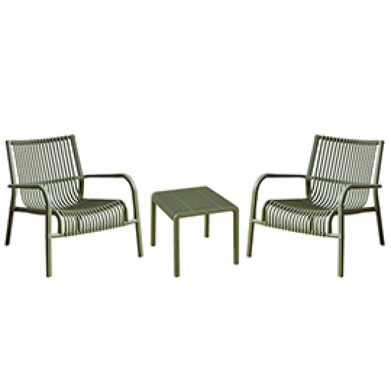 Set da giardino composto da due poltrone e un tavolino. Struttura in polipropilene, stabilizzato UV. Poltron: 75,5x63,5x69cm. Tavolino 43x43x40cm. Adatta sia per ambienti outdoor che indoor, prodotto destinato ad uso domestico.