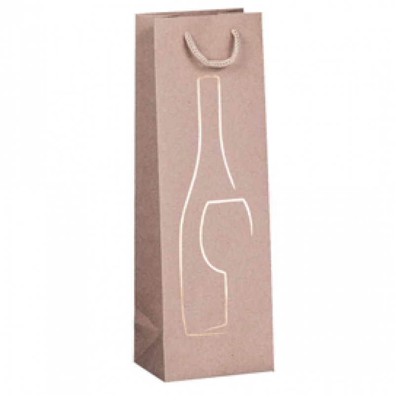Shopper portabottiglie in carta kraft 200 g/m2. Dotato di manici in corda. Stampa oro a caldo.