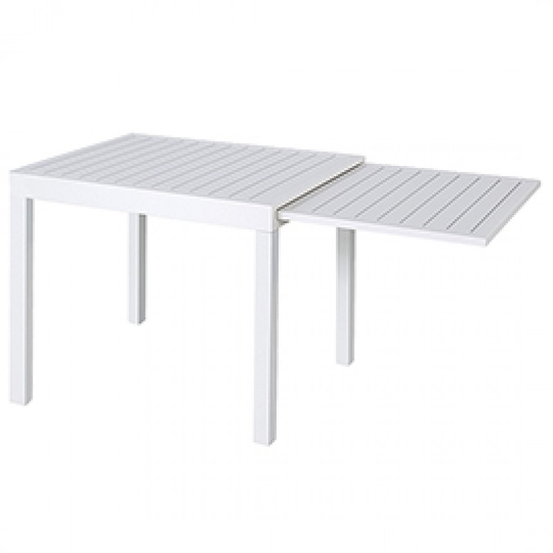 Tavolo allungabile in alluminio verniciato con top a doghe. Apertura a scorrimento. Articolo da montare. Abbinabile alle sedute sardegna: cod 105628 105629. Dimensioni: 90-180 x90 x74cm