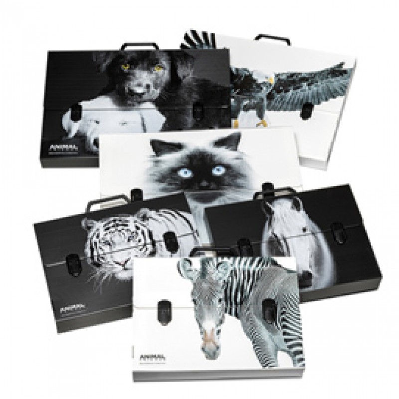 Valigetta in polionda black & white collection. Assortimento di 8 soggetti vari. Dimensioni: 28x38cm - dorso 5cm. Dotata di 2 clip di chiusura e maniglia per il trasporto.