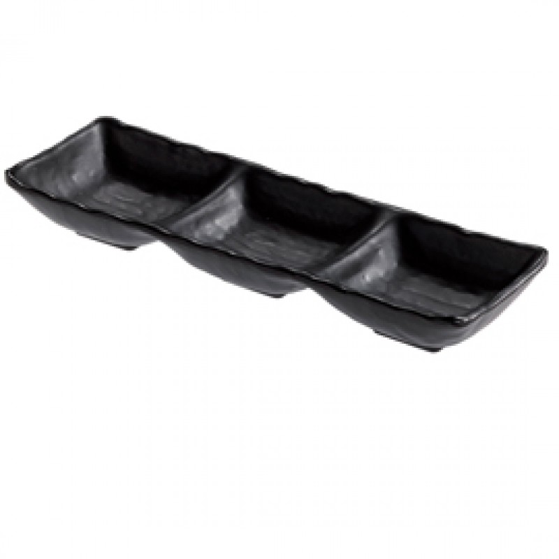 Vassoio a 3 scomparti in melamina nera, 27x9x3,5 cm. Peso netto 210gr. Capacità: 90ml +90ml+90ml Colore Nero. 100% Melamina, prodotto idoneo al contatto con tutti i tipi di alimenti (T max70°C). Articolo lavabile in lavastoviglie; Da non utilizzare con utensili taglienti. Prodotto da non utilizzare unitamente all'alimento nel forno tradizionale e forno a microonde; Conservare il prodotto in luogo asciutto,lontano dai raggi del sole e fonti di calore(0°C+35°C).